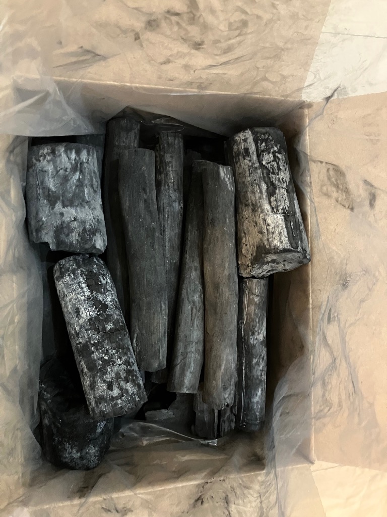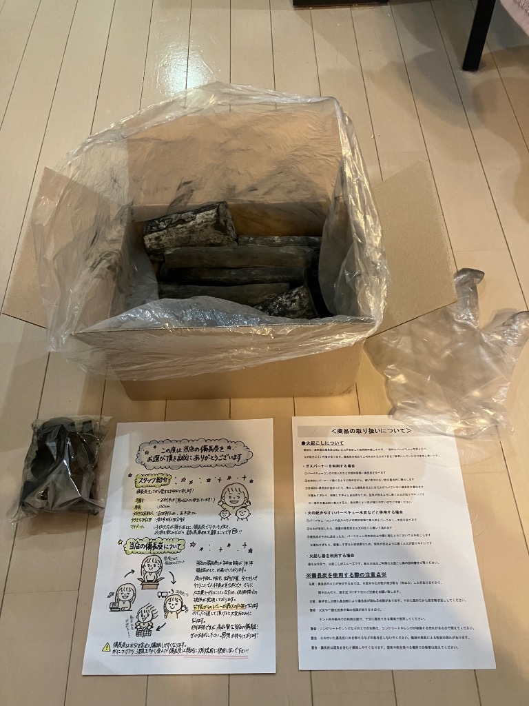 - いい買い物しました。2025/04/26注文してわずか2日で届きました。佐川で。 中身は商品説明通り。炭は長さは10センチ弱、直径3〜4センチのものが多く、長さ5センチ直径も5センチ程度の太いものもあります。 炭同士で叩くとカーンといい音が鳴ります。 丁寧な説明書きと手袋、おまけの炭のかけらも付いてコスパ良過ぎです。 バーベキューの燃料用として買いましたが、脱臭用にも使えるかもです。 なくなったらまた頼もうかと思います。